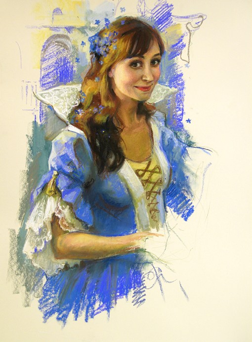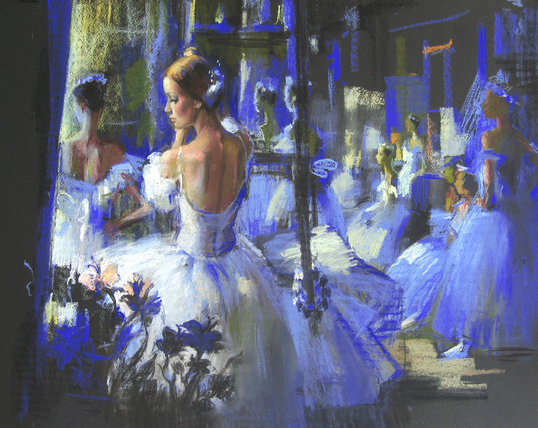 technique, which was regarded through centuries as the most obvious confirmation of artistic skill. The plot, first of all capturing one’s attention in oil painting, here nearly vanishes; instead of it the sight is attracted by the grainy surface of the thick paper, agile strokes of the pastel pencil, slightly gleaming tones or, on the contrary, by the intense touch of pure color. Pastel is unsuitable for most complicated compositions and large-scale themes. Its own intimate nature determines the correct choice of the motifs themselves. Therefore the lyrical artistic intonation of Anastasia Vоstrezova’s works is accompanied by the specific circle of certain subjects – the flower pieces evoking the noble spirit of old Russian aristocratic household; bright folk types in the spicy oriental taste; and in particular the ballet themes, the world of theater and backstage. The tender and opaque vibration of pastel colors actualizes the delicacy and grace of young ballerinas, who seem to be charming not only on the stage but also in everyday life. The informal gesture of a girl refreshing her make-up, a little tired posture of a sitting girl are all marked with the natural inner beauty, which is even difficult to speak out. In the native school of painting this careful attitude towards the model can be found in the art pieces of Zinaida Serebryakova, who also turned to the ballet theme in 1920-th. But the older artist depicted it as the magnificent brilliant feast while Anastasia interprets the ballet much more modestly. Theater appears in front of attentive spectator’s eye as the essential (but not routine) part of life, which is able to uncover with every new sight other nuances and semitones of genuine beauty.