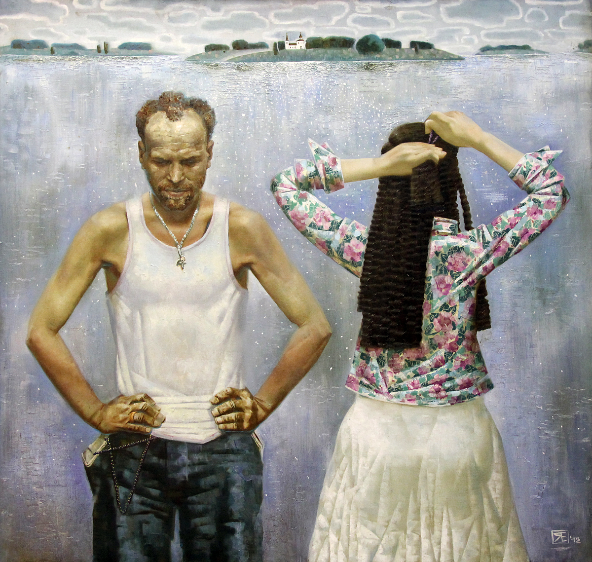 Modern writers are actively discussing what awaits the novel form of literature in the near future. Life is good for them! The artists do not argue about the figurative genre of fine art. Not arguing about anything. The figurative genre painting in halls of modern galleries and salons is virtually nonexistent. Repeating conversations that the “Genre painting” is out of date does not make sense.The genre will expire no sooner than life itself. The problem is not in the arguments of the debate. The problem is in the artists. If a person does not “see” that his world is filled with human beings, it is natural to ask the simple question – what does he see at all? And why call yourself an artist? The painting “Family”, by artist Eugene Yachny. Open space. A man and a woman. A dialogue of silhouettes, a dialogue of gestures, a dialogue of costumes. A lake and clouds. The ordinary lives of ordinary people, but if you’re an artist, there never was and never will be in our world a more interesting plot than this – a man and a woman … a lake and clouds.