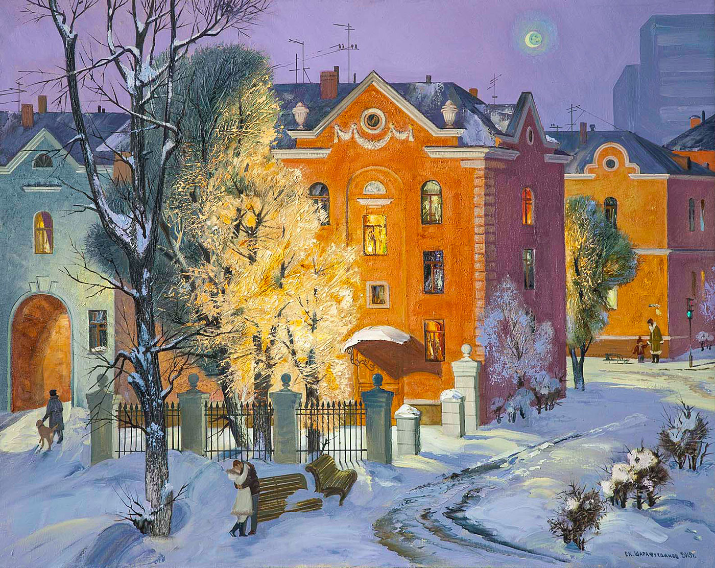 City landscape, warm and light, occupies a prominent place in the artist’s work. These nooks of the old city with resident-friendly architecture are peaceful and comfortable. The compositions imply the imperative development of a certain plot line – the lovers’ meeting, the anticipation of a meeting with a bouquet of flowers, walking a dog («The Provinces», 2006; «Magnitogorsk. Old yard», 2015; «Lilac in blossom», 2015; «Winter evening in the city 2015, and others). Within the framework of the city landscape genre there are works whose space is adjusted to different laws of compositional construction. The author focuses on the geometry of color contrasts, rhythm and the conventionality of architectural forms: textural planes of the walls, luminous quadrangles of the windows. But even this essential city structure suggests the mandatory presence of a human being as a certain countdown point in the apprehension of the author’s concept. (Diptych: «Outskirts», «Walking the doggie». 2016).