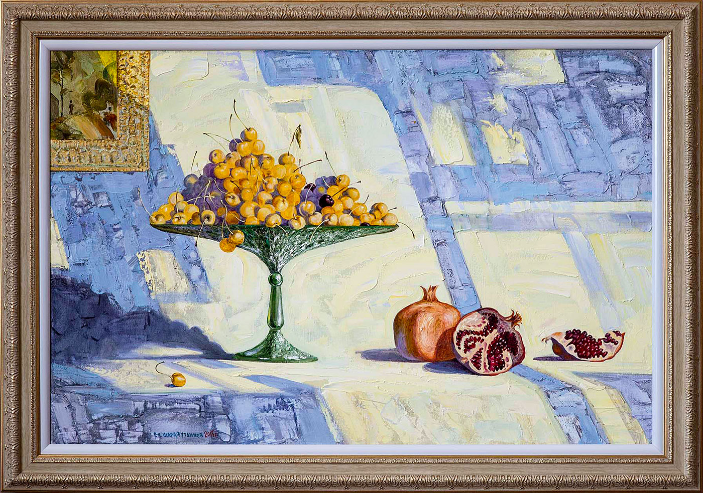 In the pictorial art domain the painter is prolific in the genres of landscape, still life, portrait and narrative paintings. While expanding the borders of the traditional chamber genres, he creates his own pictorial space where the color and form appear as the absolute aesthetic category and the artist reveals his unique image-bearing world in its full diversity. The characteristic feature of his pictorial temperament is the contemplation of the world. Through the vanity of everyday life the artist can carefully scrutinize the details of his environment. During his plain air sessions he enjoys drawing sketches that bear «the stamp of excessive excitement», and sometimes supply preliminary material for creating serious, large-format works. This is where the author achieves the intensity of his first feelings. Admiring the mundane beauty, the diversity of natural forms, he takes time to transfer his impressions onto the canvas, filling the pictorial space with his philosophic attitude to life and his apprehension of its transient nature as compared to the eternity of the mundane existence.