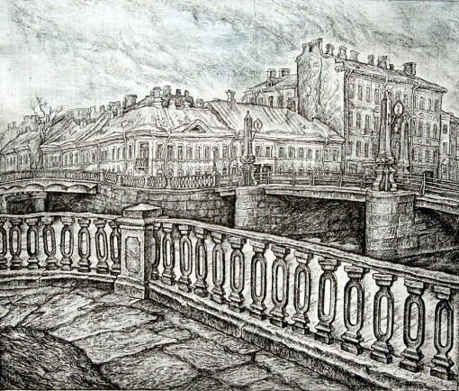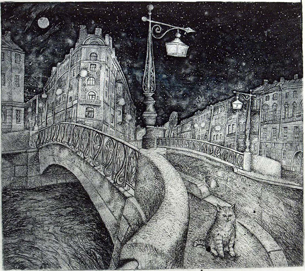 • A series of urban landscapes of St. Petersburg – the city, roadway of which have seen each and every Russian artists, is a difficult task for a master of any rank. For a series, it is insufficient just combination of scenes. It is very essential to have a new quality – the Saint Petersburg of Leonid Stroganov. And on the etching plates of this artist, such a city arises. This is not quite an ordinary St. Petersburg. Dostoevsky is not seen on its bridges, but perhaps Bulgakov may appear just around the corner. This city is still tragic at night, but a little provincial in the light of day. This is a different St. Petersburg. A St. Petersburg through the eyes of an artist from a new generation. This city can be liked by not everyone, but it already exists, because there exists a new and intriguing artist – Leonid Stroganov. ©