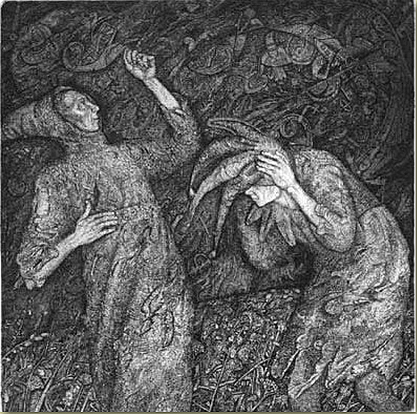 man and a woman are in the third sheet of the series “Silence,” occurs in the author’s work more than once, for example, in the previously mentioned bookplate Brodovych “Adam and Eve”. The small size and chamber genre of the bookplates do not stop it from being one of the artist’s strongest works – the engraving is beautiful in its artistic idea and deep in meaning. Heroes of a biblical myth are depicted lying on the roots of the tree of knowledge of good and evil, they are arranged with their backs to each other. Adam and Eve are close, but not together – they are far from each other. The audience’s glance at the lying down lonely and confused characters creates a special sense of the timeless existence of personas.