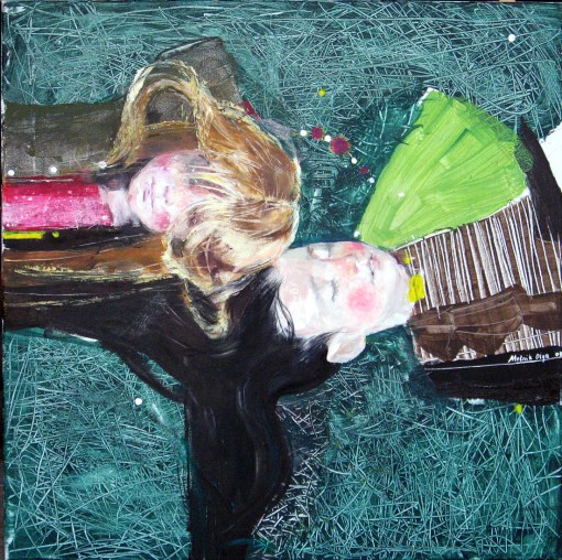 • Leonid Stroganov returned time and again to the first people of the world. Several works were made with the plot of “Expulsion from Paradise”. Two large-sized works were completed by the author in 2009. One of them depicts Adam and Eve in the moment when they leave the gates of heaven. A huge portal is framed by two dark figures, wrapped in donkey skins. They walk side by side; their closed faces and expressive gestures speak of desperation. They wander along the same road, but each has their own skin, every person for themselves. The author reveals through this Biblical story, the theme of human loneliness. The second work on the same