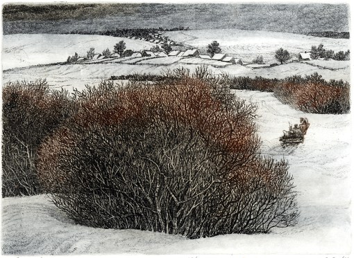 • Travelers wander timelessly on their way from the cycle “Moving” (1999). On one of the sheets of the series of the same name, under number one, a group of people is depicted under a starry sky. The wagon, a boy with a backpack, people in hoods, a woman holding a baby next to a man, all wandering after a donkey. Who are they? Refugees, pilgrims of the Middle Ages, whose life was on the road? Unwittingly, you pay attention to the last figures: “A donkey, a woman with a baby, and the man nearby”. The combination is perceived as a quote: “Holy Family on the way to Egypt.” But the woman is not sitting on the donkey, but follows him, and the face of “Joseph” is hidden under the mask. A Miracle – in the ordinary flow of life, but it cannot always be noticed and understood. In the artwork there is no emphasis on the faces of characters. Perhaps they have not yet found their persons, have not found their identity. Through the procession, attention is drawn to the figure of a teenager carrying a load on his shoulders, precisely because he has a face. The boy with the backpack is similar to the artist himself. Does this mean that he walks among his characters behind a cart along a road in the flow of people? There is a feeling of not only a myth, but also a parable. There is a special feeling of a mystical-philosophical “Stroganov” aura, which is the hallmark of the work of this young and very talented artist.