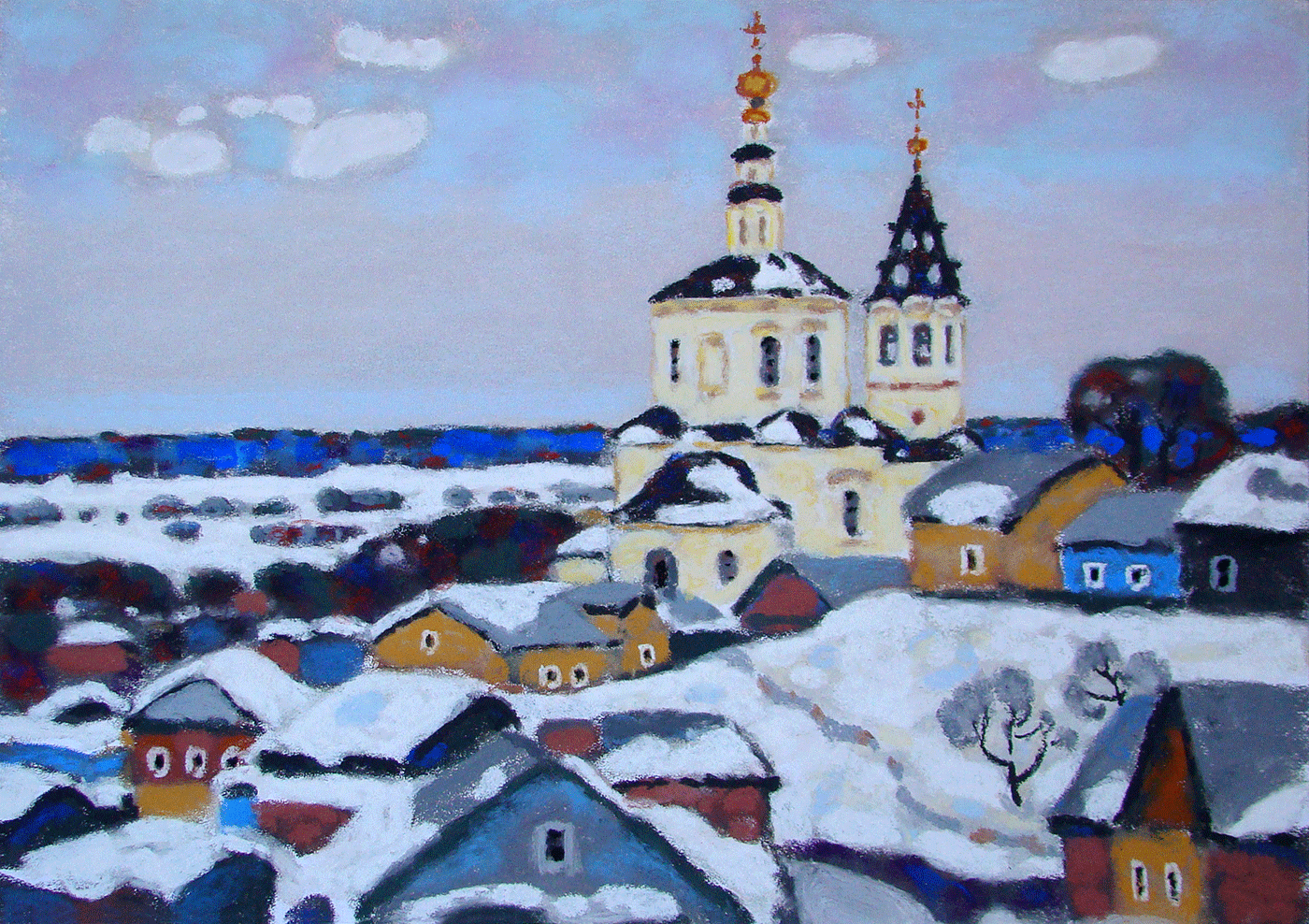 • To the sophisticated traveler, Ukrainian city landscape motifs seem sad and not always attractive. The painter Aleksandr Pavlovets can poeticize the heavy with spring moisture, unfussy, stooping in the wind, patio of Dnepropetrovsk. He can breathe a pulse into the classically boring prospect of an autumn street with a cathedral steaming in the fog, with a shimmering gilded dome. He can convince the viewer in the Baroque freshness of a pseudo-baroque motif of the historic part of the city. Finally, he can evoke from the viewer a sense of nostalgia, born by the natural pull of a citizen to the aesthetics of not only the parade architecture, but also the shaded courtyard provincial architecture.