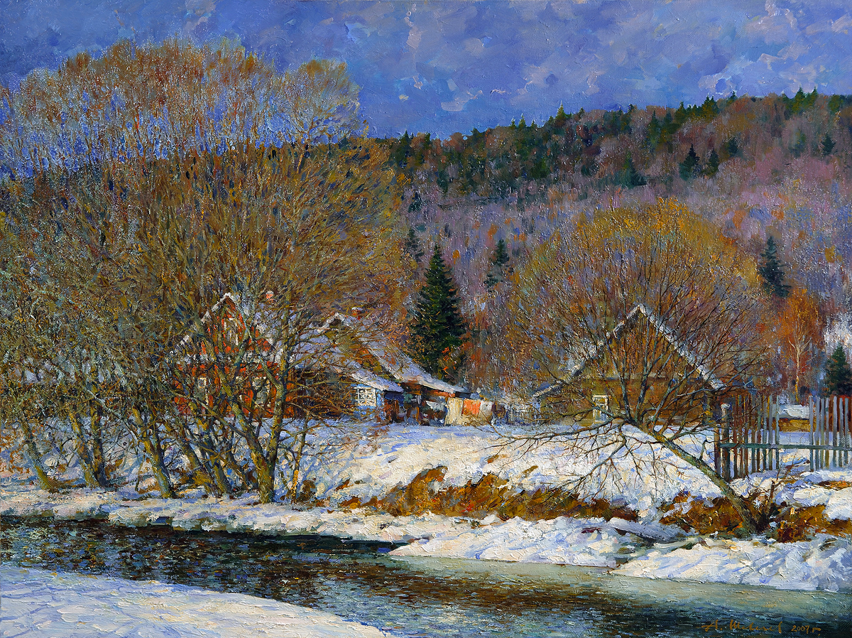 • All his life Vitaly Gubarev is seeking to get an idea of the harmony of the relationship between a human being and the nature across all his contemporaries. Yury Baturin, the pilot cosmonaut of Russia, wrote from Zvezdnyi Gorodok as follows: «After a cosmonaut returning from his flight his feelings and sensations are flared up. He begins to see and notice all objects that he habitually passed by before without turning his head, especially in the nature. I saw from a new angle the beauty of common trees, rivulets and clouds on the sky after my returning from the outer space on Earth in 1998.1 saw all that objects just so how Vitaly Gubarev painted them in his pictures as «The Summer. The Protva Rivulet», «The Autumn», and etc… I have travelled around the small Russian provincial towns and common villages for several years where my antecedents lived in starting from XVIII to XX centuries. Certainly, I’m taking photograph… However, I have felt «the aura of that life» viewing only the Gubarev’s works such as «The Wintry Evening», «The Peal of Bells», «Winter», «The White Snow» and «The Rest in the Village» . These works helped me to my best understanding and feeling of those people and that life that I want to describe in my book». Really, it is rather high appraisal and one can be proud of it.